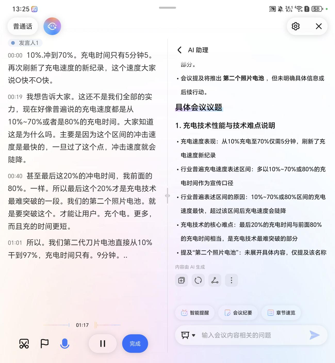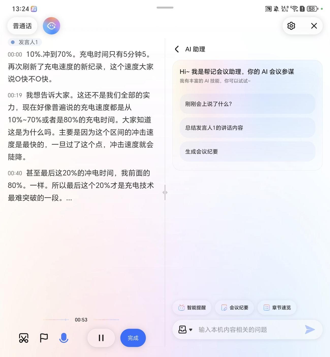 在提前设置好关键词后,无需担心会议的提及、或者重要事项被遗漏,比如设置发言人后,它会实时记录发言人对此的发言,同时在右侧可以自动生成会议纪要。