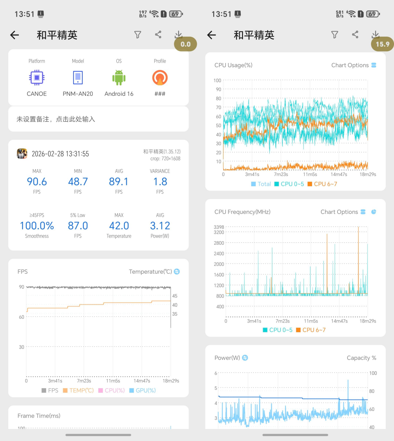 和平精英方面,荣耀Magic V6平均帧89.1fps,5%Low帧为87fps,帧率上几乎一条直线。