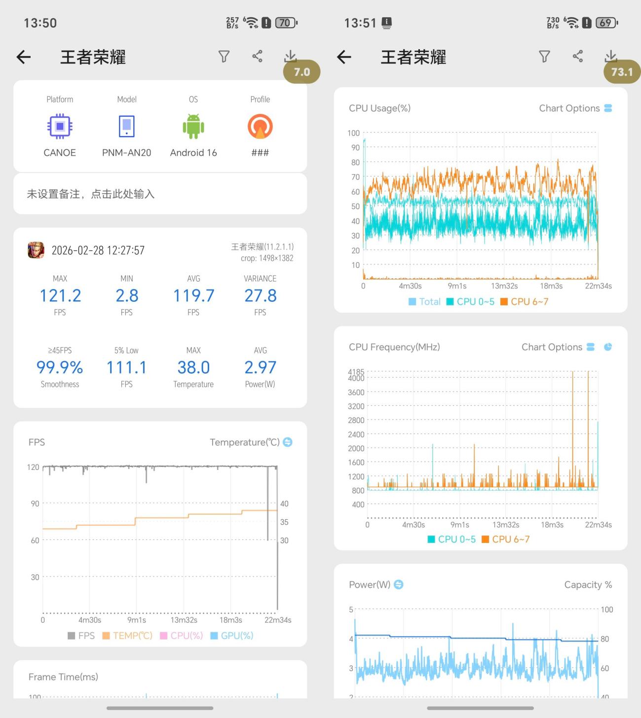 荣耀Magic V6在王者荣耀的帧率上也十分稳定,平均帧119.7fps、5%Low帧为111.1fps,最大温度为38℃。帧率波动也比较平稳,没有太大波动。