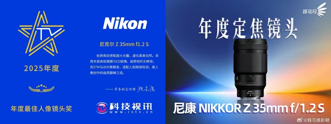 此外,尼克尔 Z 35mm f/1.2 大光圈定焦镜头,以极致的背景虚化效果、细腻的画质表现与精准的对焦性能,成为人像创作的利器。不仅丰富了尼康 Z 卡口专业光学生态,还一举斩获科技视讯“年度最佳人像镜头奖”、蜂鸟网“年度定焦镜头奖”。