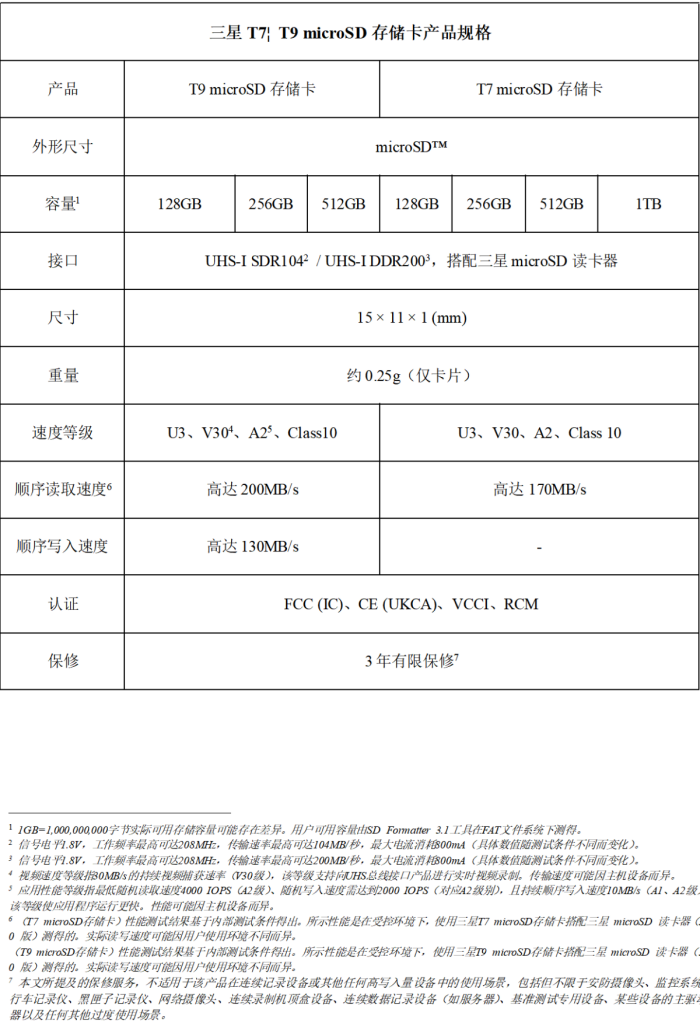 三星T7 microSD存储卡提供128GB、256GB、512GB和1TB四种容量选项,而T9 microSD存储卡则提供128GB、256GB和512GB三种容量选项。该产品将于2026年4月30日面向消费者发售。