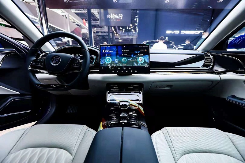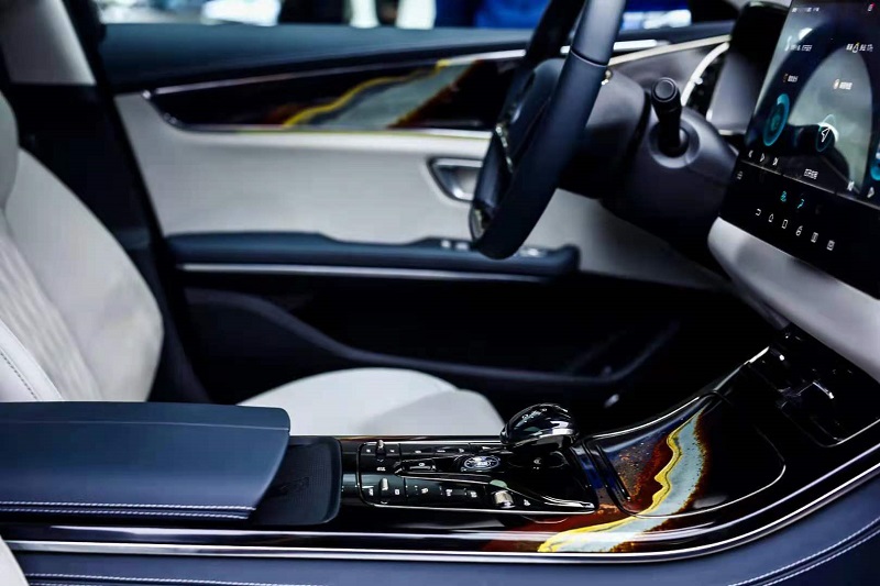 在汉DM展车上,以大漆工艺制造的装饰面板尤为抢眼,这是比亚迪邀请大漆国家级工艺传承人傅以周老师作为顾问,广东省工艺美术学院漆艺专家吴永强老师亲自为汉设计制作的成果,是精湛的漆工艺与新能源汽车内饰设计巧妙结合的跨界力作,更是比亚迪践行中华优秀传统文化创新性发展的一次新探索。