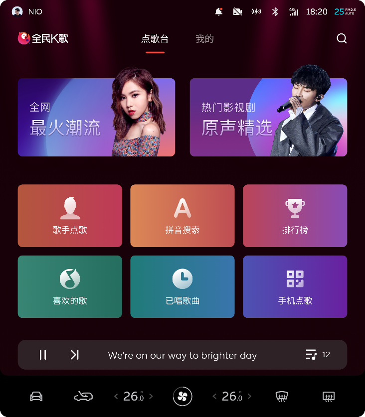 全民K歌是一款广受欢迎的手机K歌交友软件。为使车内的娱乐体验更加丰富有趣,蔚来推出车内卡拉OK应用“全民K歌”。全民K歌拥有超过1000万首的海量曲库,除屏幕操作点歌外,还支持在车上QQ音乐界面跳转点歌、手机扫码点歌。