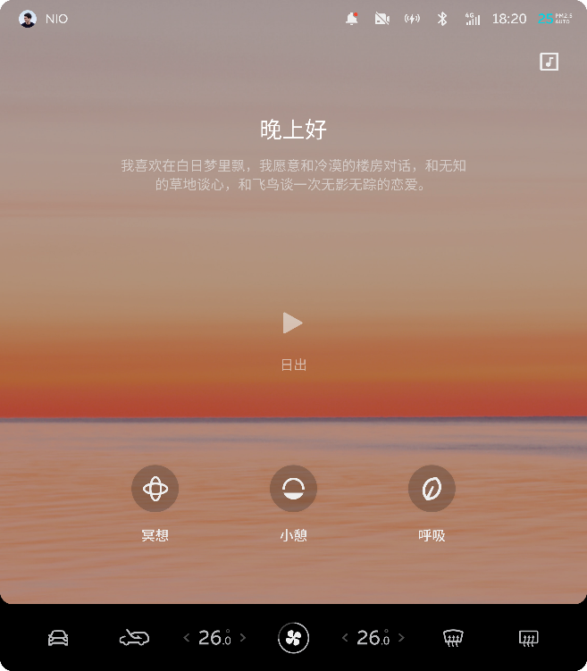 潮汐是一款著名生活健康应用App。蔚来基于用户在车内空间的真实使用场景需求,推出车内潮汐应用。潮汐应用提供小憩、冥想与呼吸三种模式,通过融合沉浸式背景音(支持5.1声道)及联动座椅、空调、灯光、音响等设备,打造更舒适惬意的车内空间。