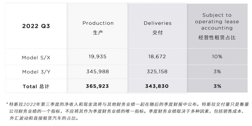 DoNews汽车10月3日消息,10月2日,特斯拉正式公布2022年第三季度汽车生产与交付报告。数据显示,特斯拉第三季度共生产了超过36.5万辆汽车,交付了超过34.3万辆汽车。该季度交付表现再创新高,同比增长42.4%、环比增长34.9%。