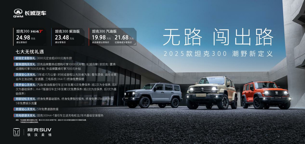 3月10日,2025款坦克300于珠海横琴文化艺术中心全动力焕新上市。2025款坦克300 Hi4-T建议零售价24.98万元,2025款坦克300柴油版零建议售价23.48万元,2025款坦克300挑战者建议零售价19.98万元,征服者建议零售价21.68万元。