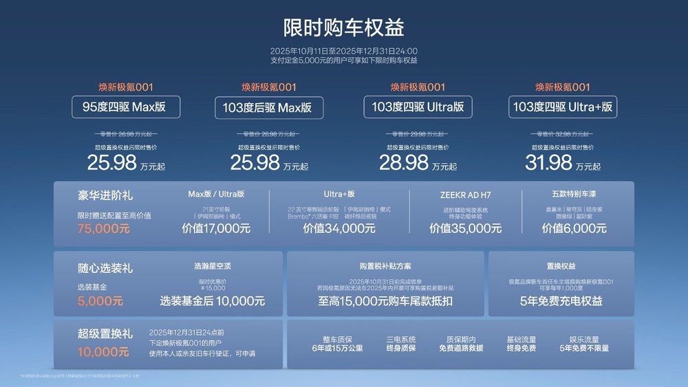 10月11日,豪华猎装轿跑焕新极氪001正式上市,官方零售价26.98万元起,超级置换权益后,限时售价为25.98万元起。即日起,用户可通过极氪App、官网、小程序及全国极氪门店等官方渠道预订。