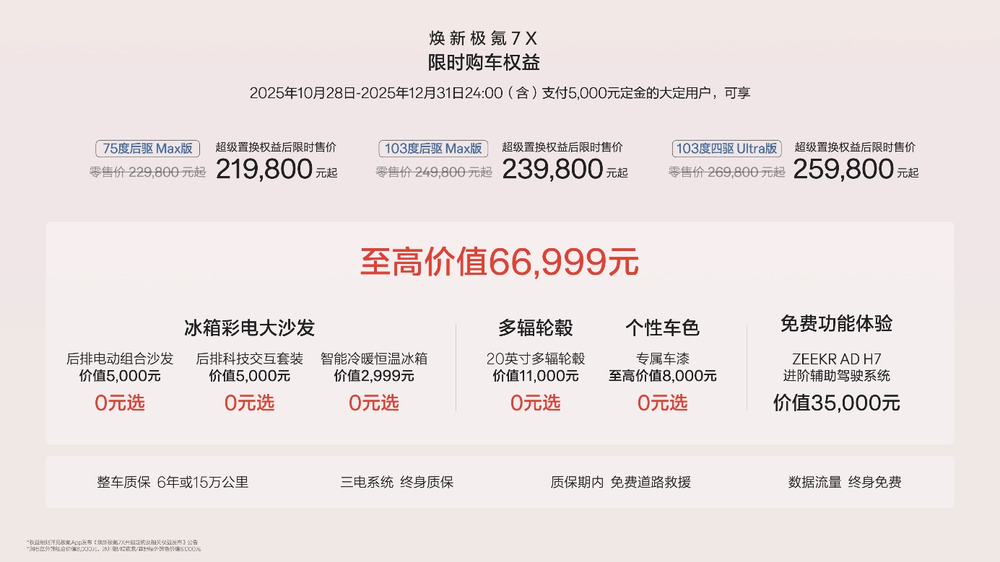 2025年10月28日至12月31日(含)期间支付5,000元定金的大定用户,全系赠送价值12,999元的冰箱彩电大沙发,全系免费升级20英寸265mm宽胎以及专属车漆,并可享价值35,000元的ZEEKR AD H7进阶辅助驾驶系统终身免费功能体验。 与此同时,首任极氪老车主增换购焕新极氪7X可享每年1000度的5年免费充电权益。此外,2025年11月30日(含)前,下定且锁单的用户,如因极氪原因,无法在2025年开票交付,导致无法全额享受购置税优惠,对于政策退坡产生的差额,极氪品牌提供至高13,500元的购车尾款抵扣。