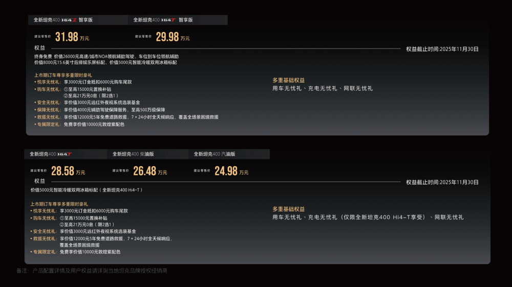 全新坦克400 Hi4-Z智享版,售价31.98万元;全新坦克400 Hi4-T智享版,售价29.98万元;全新坦克400 Hi4-T,售价28.58万元;全新坦克400 柴油版,售价26.48万元;全新坦克400 汽油版,售价24.98万元。即刻下单可享多重尊崇权益,坦克以满满诚意为年轻用户体验潮酷越野带来惊喜购车优惠。