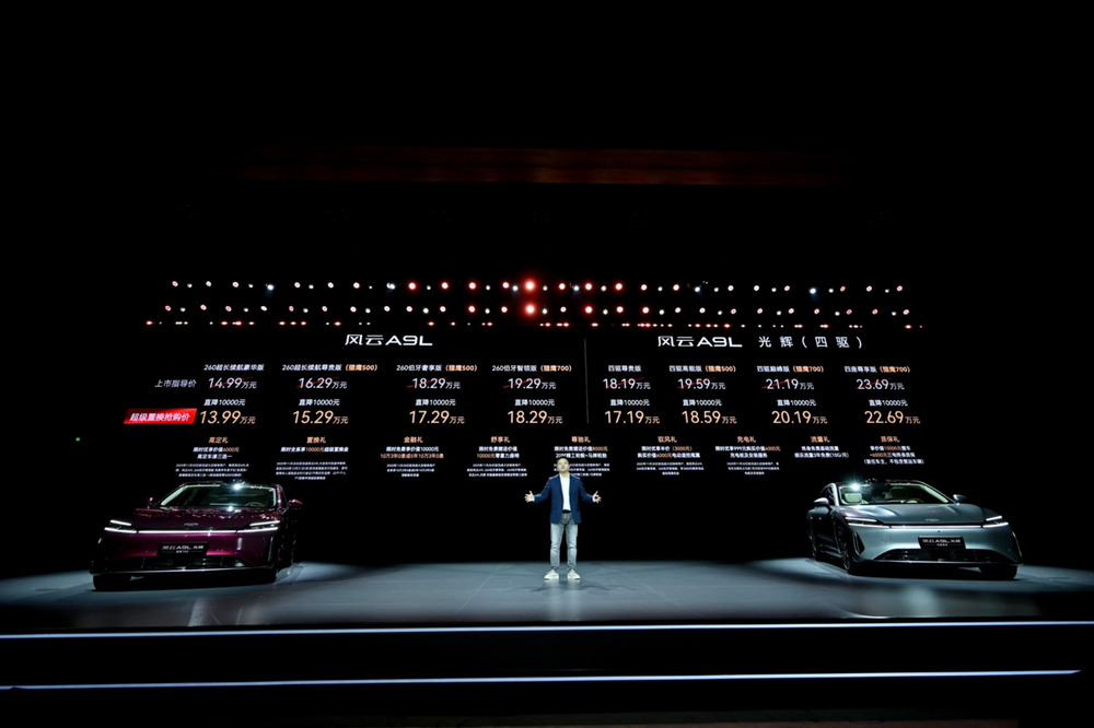 11月15日,"进化"风云A9L光辉(四驱)全球上市发布会在重庆广阳岛国际会议中心隆重举行,本次上市共推出四款版型,正式售价为17.19万元起,共推出四个版本车型,其中四驱尊贵版售价17.19万、四驱高能版(猎鹰500)售价18.59万、四驱巅峰版(猎鹰700)售价20.19万、 四驱尊享版(猎鹰700)售价22.69万。并同步推出"九大购车权益",涵盖高定、置换、金融、舒享、尊驰、驭风、充电、流量、质保多重礼遇,为中国豪华汽车市场再次立下全新标杆。