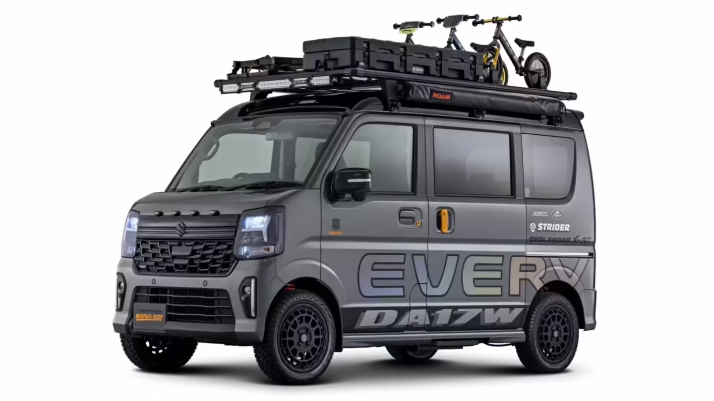 Every Wagon Wanpaku Rider 面向家庭用户,突出轻自动车的户外玩法。车顶行李架可同时固定 3 辆儿童自行车,并搭配储物箱、LED 灯条和折叠式遮阳篷。更粗壮的轮胎、黑化中网以及熏黑灯组,让整车风格更加硬朗。