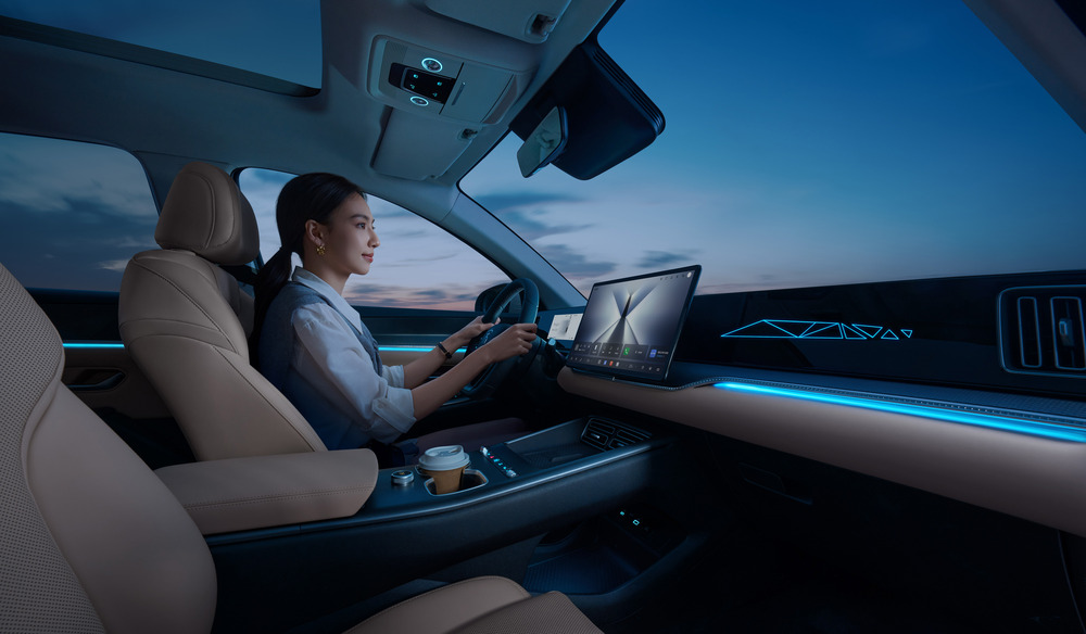 座舱内的智能化体验同样丰富。新增的一体式智能冷暖冰箱、前排座椅通风加热、感触式广角全景天窗、31 色环抱式情景氛围灯,结合15.6寸中控Pad与沉浸式音乐厅级音响,共同营造出高品质的舒适氛围。整车支持OTA远程升级,确保这些智能舒适体验常用常新。