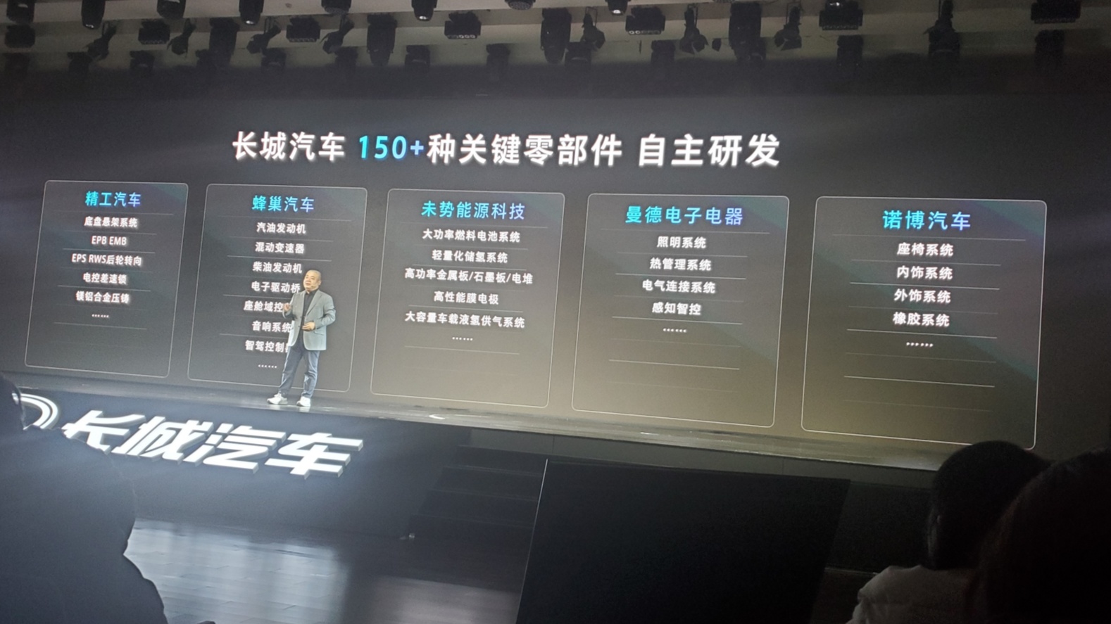 据穆峰在发布会上介绍,从研发到制造工艺,从底层算法到质量管理,长城汽车掌握核心技术自研能力与垂直整合,超过150种关键领域实现自制:横置、纵置汽柴油发动机,电池、电机、电控,氢燃料系统,还有空气弹簧、转向器、车架、座椅;座舱域控制器、智驾域控制器,超声波雷达、毫米波雷达,再到音响、空调、热管理、灯具、密封件等。