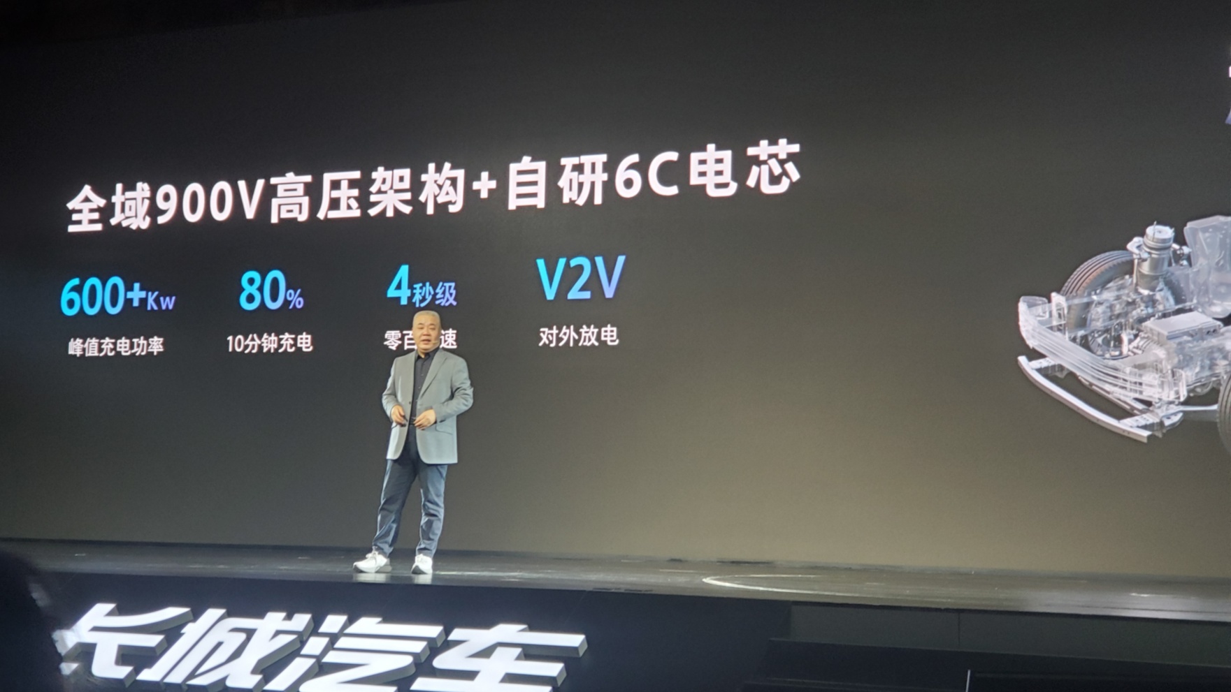 超级BEV则采用全域900V高压架构,配合自研6C电芯,可实现续航660KM,峰值充电功率600KW以上,10分钟充电80%,零百加速4秒级,支持V2V对外放电。