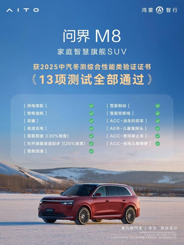 问界M8“新豪华”的实践与探索收获了专业领域的全面认可。截至目前,其已成功揽获C-NCAP(2024版)超五星安全认证、中国汽研《C-AHI中国汽车健康指数》“五星健康车”认证、CA-CAP测试“白金等级”证书、中汽中心“综合性能类验证”“智能底盘安全技术验证”、中汽院“C-STAA车型”等多项权威认证,涵盖整车安全、健康座舱、持久耐用、技术可靠性等多个维度,印证了问界M8作为新豪华标杆的行业地位与核心竞争力。