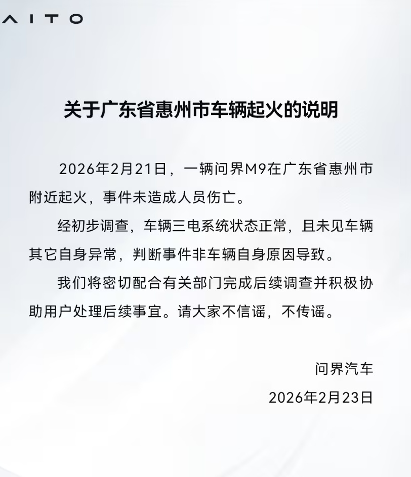 2026 年 2 月 21 日,一辆问界 M9 在广东省惠州市附近起火,事件未造成人员伤亡。