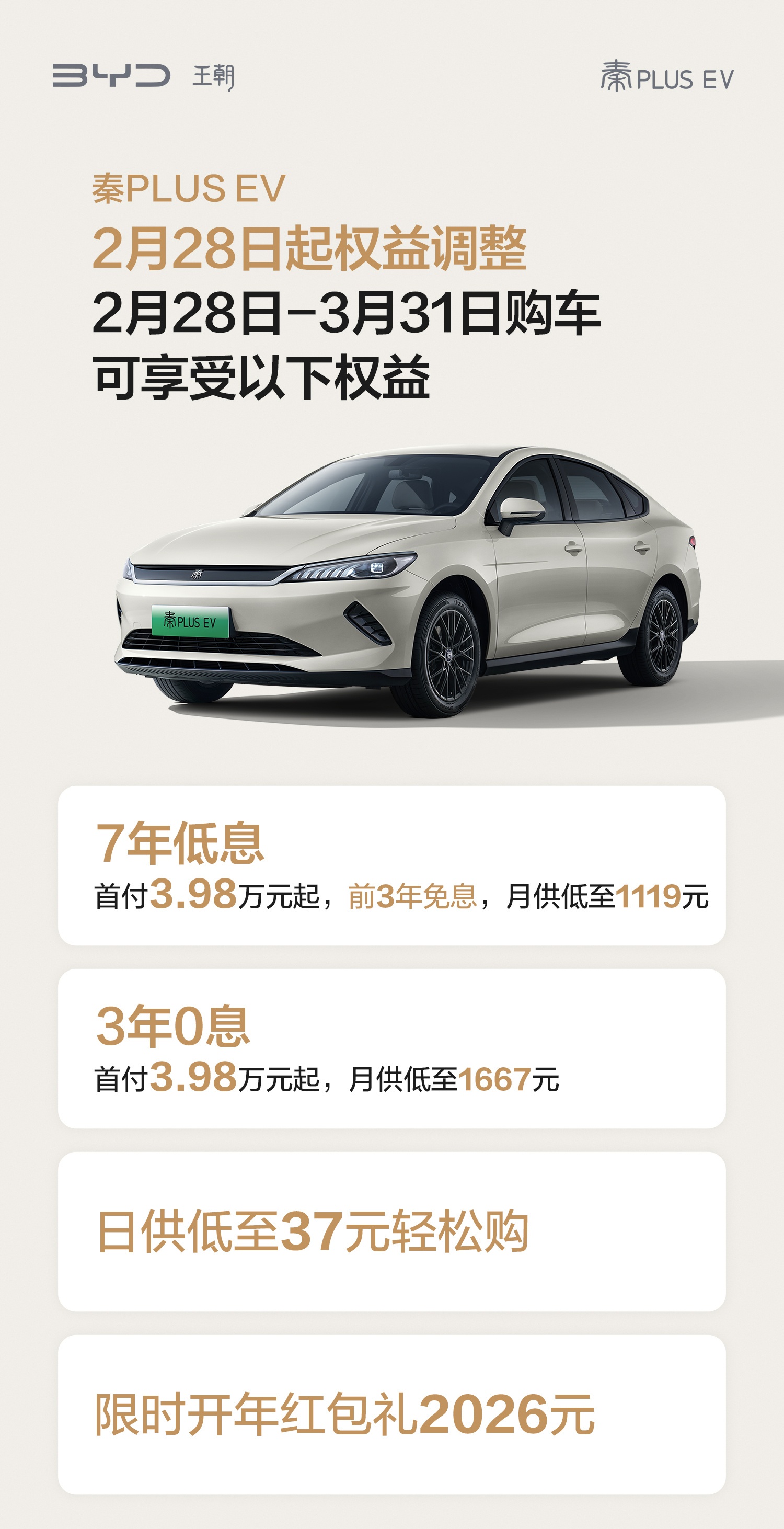 DoNews汽车2月28日消息,比亚迪王朝网销售事业部总经理路天今日官宣,比亚迪秦 PLUS 迎来史上最强金融政策(3 月 31 日截止):3 年 0 息方案:首付 2.98 万起,月供低至 1389 元;7 年低息方案:首付 2.98 万元起,前 3 年免息,月供低至 933 元。
