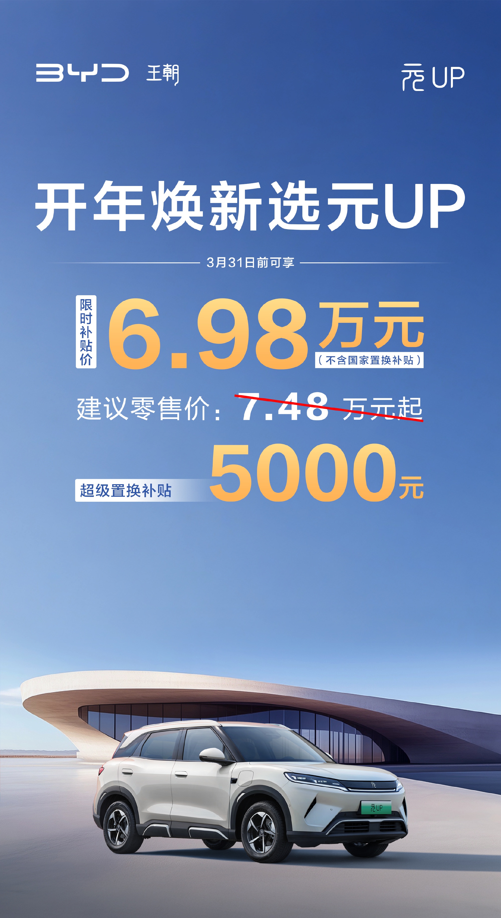 此外,截至 3 月 31 日(含),元 UP 享超级置换补贴 5000 元,综合补贴后 6.98 万元起。该活动同样 3 月 31 日截止。