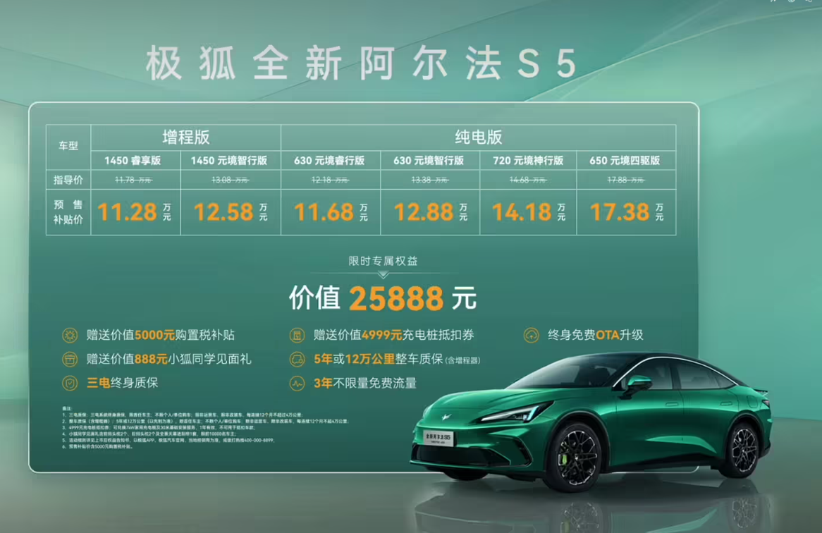 DoNews汽车3月1日消息,极狐汽车旗下全新车型阿尔法 S5 今日正式启动预售,官方指导价 11.78 万元起,补贴价 11.28 万元起,下定可享价值 25888 元的限时专属权益。