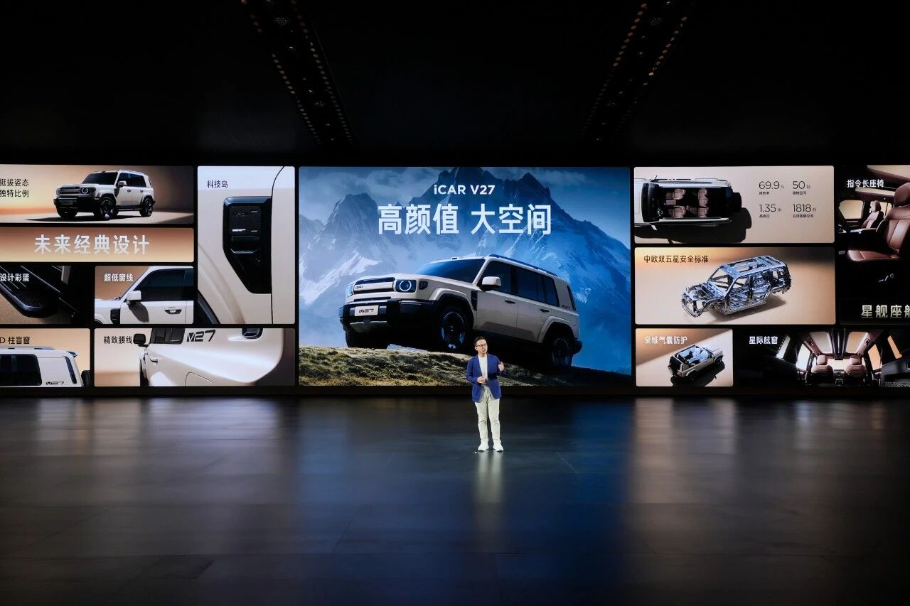 iCAR V27采用未来经典设计理念,融合经典越野姿态与精致科技,在秩序与简洁中凸显独特风格。车身超5米,搭配近1:1宽高比、直立A柱,姿态挺拔,勾勒硬派风格比例,超低窗线与高占比侧窗,营造通透视野。高集成度科技岛,在极简中透出科技精致,打造出穿越周期的经典美学。