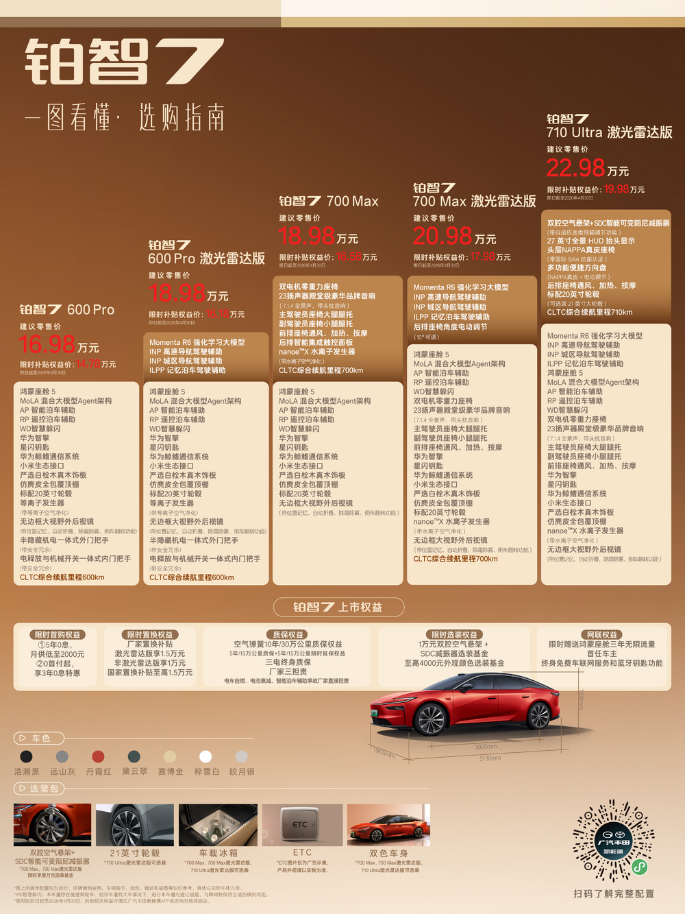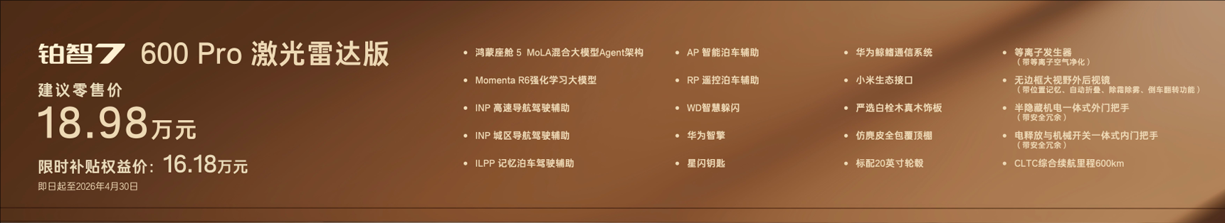 铂智7600Pro版,版本基础配置不基础,入门即豪华,限时补贴权益价14.78万。同价位最大尺寸旗舰轿车,标配内置MoLA架构的鸿蒙座舱5,具备类人化智能交互,搭载带智能泊车的L2级智驾、华为智擎、尊界同款星闪钥匙、纯天然实木内饰和座椅通风加热、20寸轮毂等超15项豪华配置。D级车的尺寸和享受,B级车的价位,加上丰田全球品质兜底,性价比断层领先。
