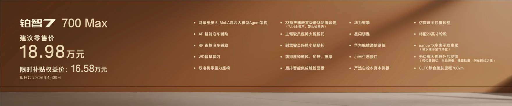 顶配710 Ultra激光雷达版限时补贴权益价19.98万,不仅集齐鸿蒙座舱和激光雷达智驾、双腔空悬、零重力座椅、23扬声器等全豪华配置,实现豪华“一步到位”,还把给足情绪价值的27英寸全景HUD抬头显示、NAPPA真皮方向盘和座椅、智能香氛系统等统统安排,是同价位最超值的选择。