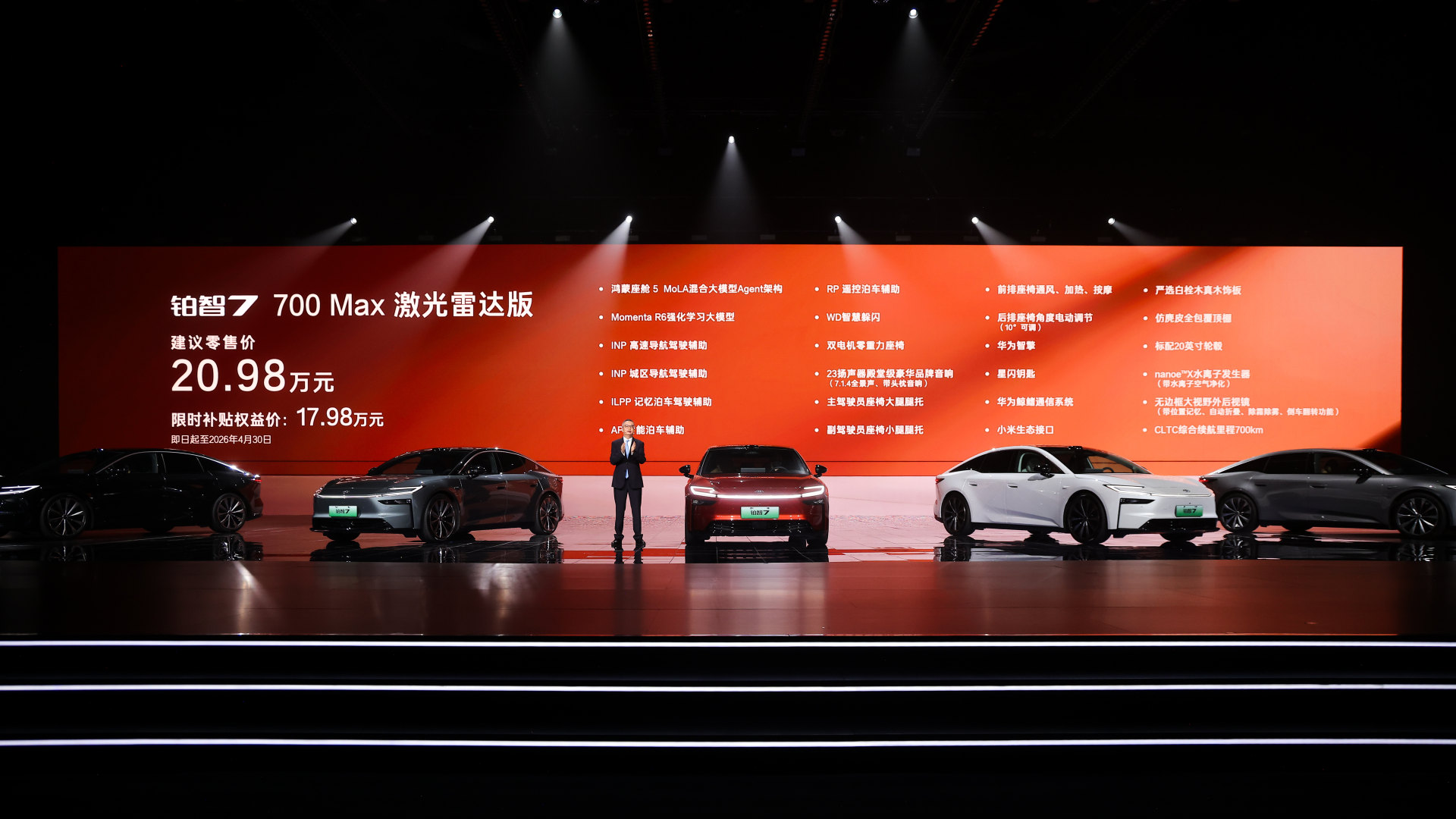 700km续航提供三个版本,全部标配双电机零重力座椅、主驾大腿托、后排智能触控面板和23扬声器等超11项配置,过往30万以上车型的豪华舒适配置,全部下放到20万以下。700Max版聚焦长续航与高阶舒适,限时补贴权益价16.58万,加5000元即可选装行业最低价的双腔空悬,拥有17万级双腔空悬纯电家轿第一车。700Max激光雷达版限时补贴权益价17.48万,增加Momenta R6大模型高阶智驾辅助。再加5000元选装基金即可升级至700Max激光雷达双腔空悬版,一次性配齐华为鸿蒙座舱5、Momenta R6大模型激光雷达智驾、双腔空悬等超豪华三件套,20万内唯一。