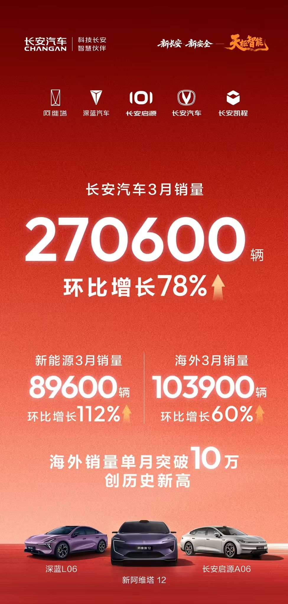 今年 3 月,长安新能源汽车销量达 89600 辆,环比增长 112%。长安启源 3 月销量 36875 辆,环比增长 102%,全新 Q053 月交付 12600 辆,环比增长 188%。