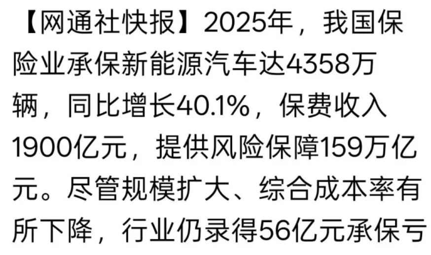 今年新能源车保险市场的数据,就很有代表性。公开数据显示,【2025年我国保险行业承保新能源汽车4358万辆,实现保费收入1900亿元,但承保端依然亏损56亿元。】这组数据一边说明新能源车险规模还在快速扩张,另一边也说明车主抱怨“保费高”、保险公司抱怨“赔付难”的矛盾并没有真正缓解。