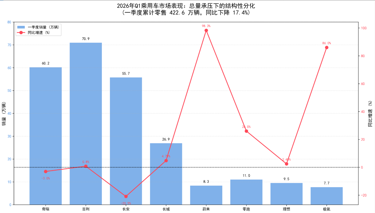 2026年的春天,中国车市并未迎来预期的“小阳春”,反而陷入了一场前所未有的“倒春寒”。据中国汽车流通协会数据显示,一季度乘用车累计零售422.6万辆,同比下降17.4%,成为近十年来(除2020年疫情特殊时期外)最差的开局表现。曾经喧嚣尘上的“价格战”似乎在一夜之间熄火,取而代之的是销量的剧烈波动与头部阵营的悄然洗牌。