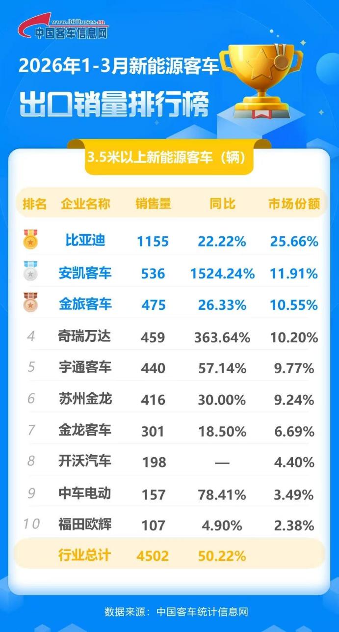 据中国客车信息网数据显示,2026年3月,比亚迪新能源客车出口再次位列第一,同比增速21.52%,高于行业平均水平,领跑新能源客车出口销量增长。至此,一季度,比亚迪新能源客车总出口1155辆,市场份额25.66%,稳居榜首;是行业唯一出口新能源客车超过1000辆的企业,也已连续三年蝉联新能源客车出口冠军。