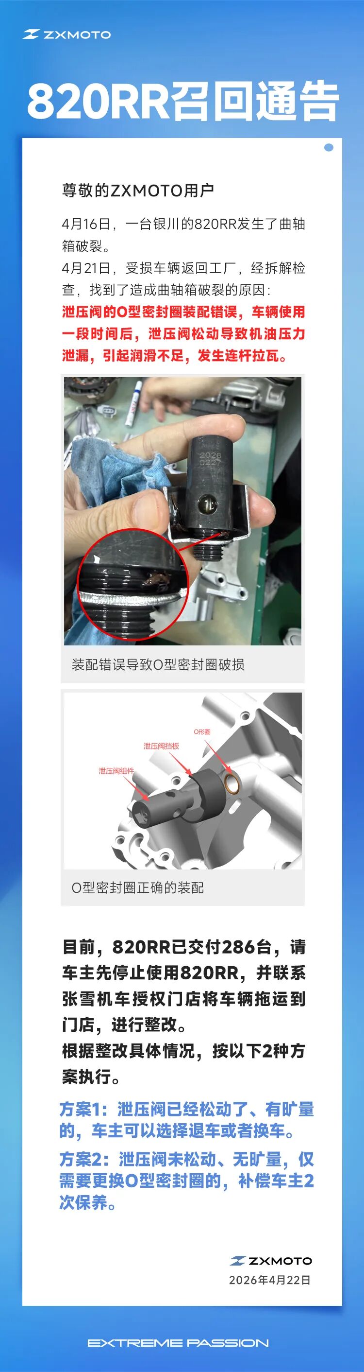 通告称,4月16日,一台银川的820RR发生了曲轴箱破裂。4月21日,受损车辆返回工厂,经拆解检查,找到了造成曲轴箱破裂的原因:泄压阀的O型密封圈装配错误,车辆使用一段时间后,泄压阀松动导致机油压力泄漏,引起润滑不足,发生连杆拉瓦。