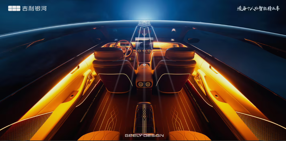 该车顶部预计会有全景天幕,内饰图可以看到四座布局、前后空调出风口、金色氛围灯。