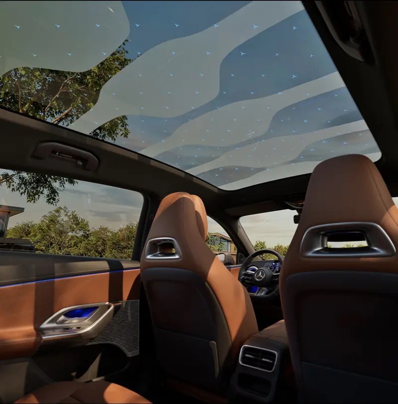 全新奔驰纯电GLC SUV将经典的奔驰美学进行了全新演绎。复古盾格式格栅以数字化方式呈现,靠近时942颗聚碳酸酯背光呼吸式点亮。有别于同质化的贯穿式灯带,前后灯组均以三叉星徽造型设计,无论昼夜,“一目奔驰”。车内,奔驰史上最大MBUX超联屏,尺寸达39.1英寸,无缝式大屏横贯座舱横向空间,并配备2种不同主题氛围模式,以动态画面、氛围灯光、主题音效与座椅加热/通风的联动,呈现视觉科技与色彩艺术交融的盛宴。头顶的多区智控星徽全景式天幕采用多层高科技材料,运用PDLC(聚合物分散液晶)技术,可实现9个分区的透明度独立调节。天幕采用3层镀银,实现99.4%红外线隔绝率与99.9%的紫外线隔绝率,更针对手机信号进行强化优化,隔热防晒,又时刻在线。天幕内嵌162颗细小发光星徽,可与64色环境氛围灯同色调节,夜幕降临,抬头漫天星徽,触手可及。此外,Burmester® 4D环绕立体声音响系统采用多至19个扬声器+2个座椅振荡器,配合杜比全景声®,营造沉浸式的声音盛宴。奔驰独家的6种“SoundExperience”整体式音效系统贯穿靠近、上车、驾驶、泊车充电到离车5大情景,从欢迎、启动到触发指令、发出警报,让车辆本身也有语言,予你温润交流质感。