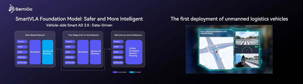 依托Smartware2.0 自研中间件,斑陌易行打造乐高式模块化软硬件架构,统一接口、预埋硬件、按需组合,实现开箱即用、快速部署、易扩展、易维护,真正做到 “即刻落地”。基于 NVIDIA Alpamayo 1.5 开源基座构建的SmartVLA 大模型,在 Jetson Thor 平台首次完成无人物流车上的部署,让车辆具备真实场景理解与自主决策能力,实现更安全、更智能的自动驾驶。