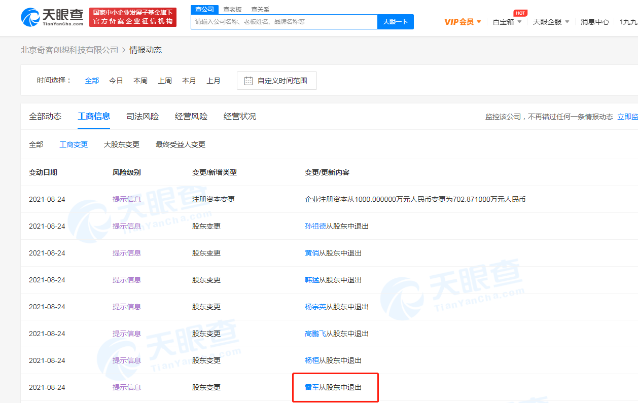 天眼查App显示,近日,7k7k游戏关联公司北京奇客创想科技有限公司发生工商变更,原股东雷军等退出,同时注册资本从1000万减至约703万。