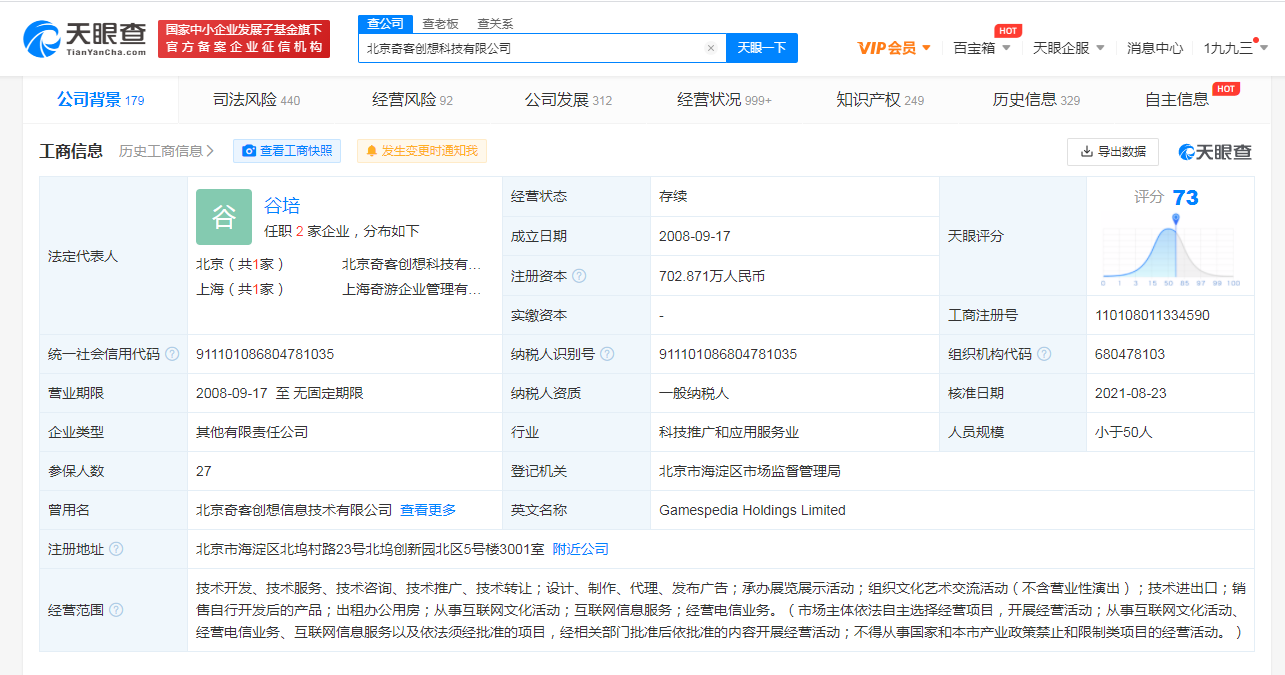 北京奇客创想科技有限公司成立于2008年9月,法定代表人为谷培,经营范围包括销售自行开发后的产品;从事互联网文化活动;经营电信业务等。