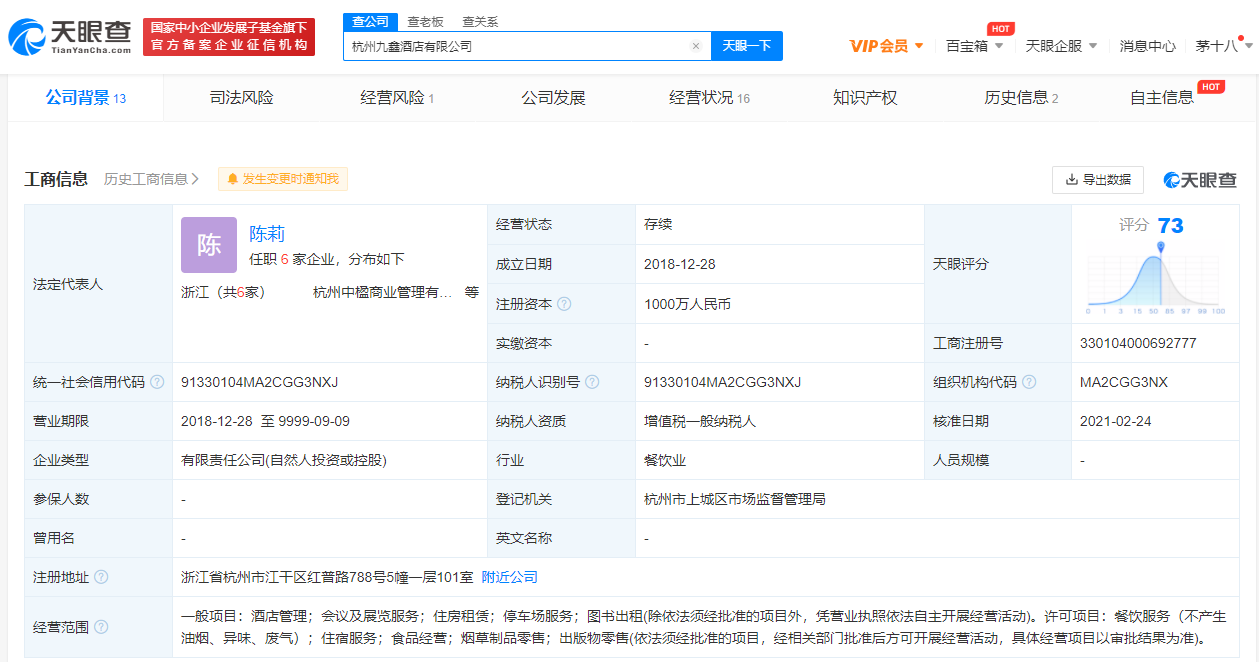 天眼查App显示,涉事杭州绿谷景澜酒店关联公司为杭州九鑫酒店有限公司,成立于2018年12月,注册资本1000万人民币,法定代表人为陈莉,经营范围包括酒店管理;餐饮服务;住宿服务等。