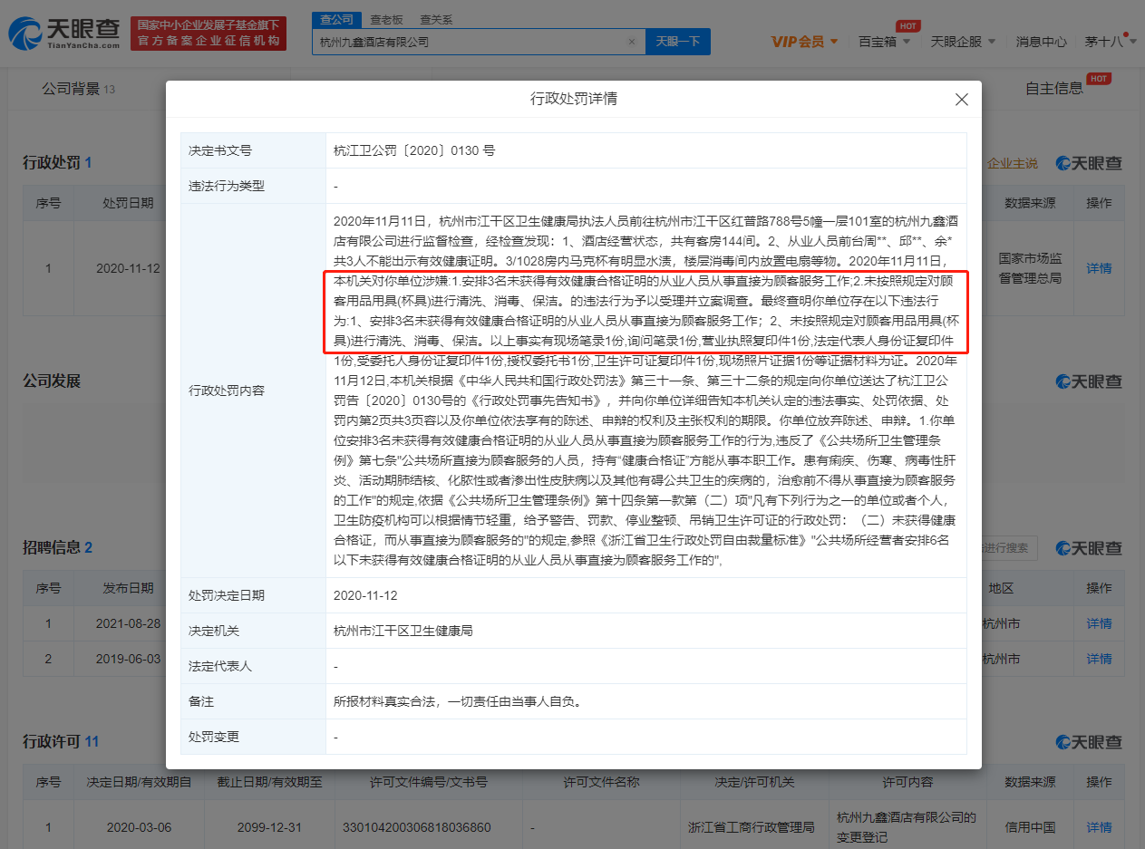 值得一提的是,2020年11月,该公司因安排3名未获得有效健康合格证明的从业人员从事直接为顾客服务工作等违规行为被处罚。