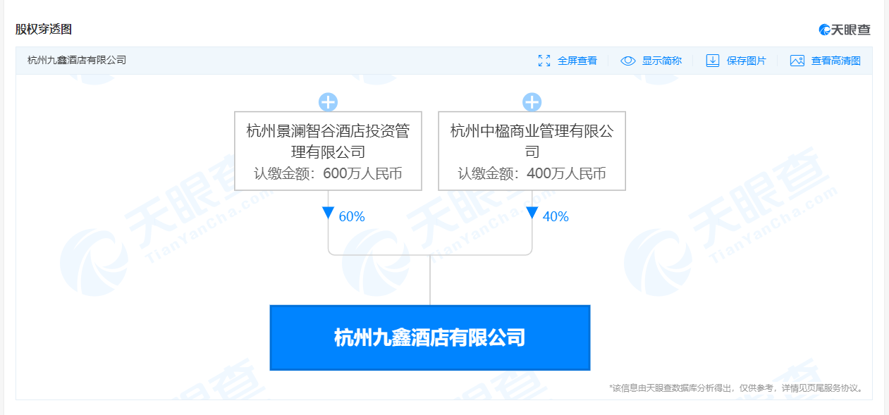 股权穿透信息显示,该公司由杭州景澜智谷酒店投资管理有限公司、杭州中楹商业管理有限公司共同持股,持股比例为60%、40%,疑似实际控制人为陈俊。