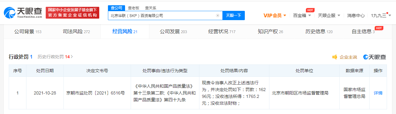 天眼查App显示,近日,因违反《中华人民共和国产品质量法》第十三条第二款;《中华人民共和国产品质量法》第四十九条,北京华联(SKP)百货有限公司被北京市朝阳区市场监督管理局罚款16296元;没收违法所得1765.2元。