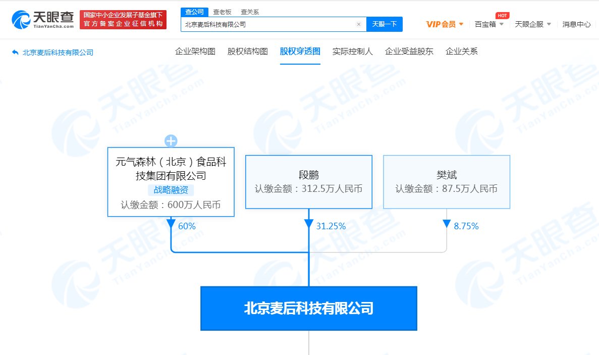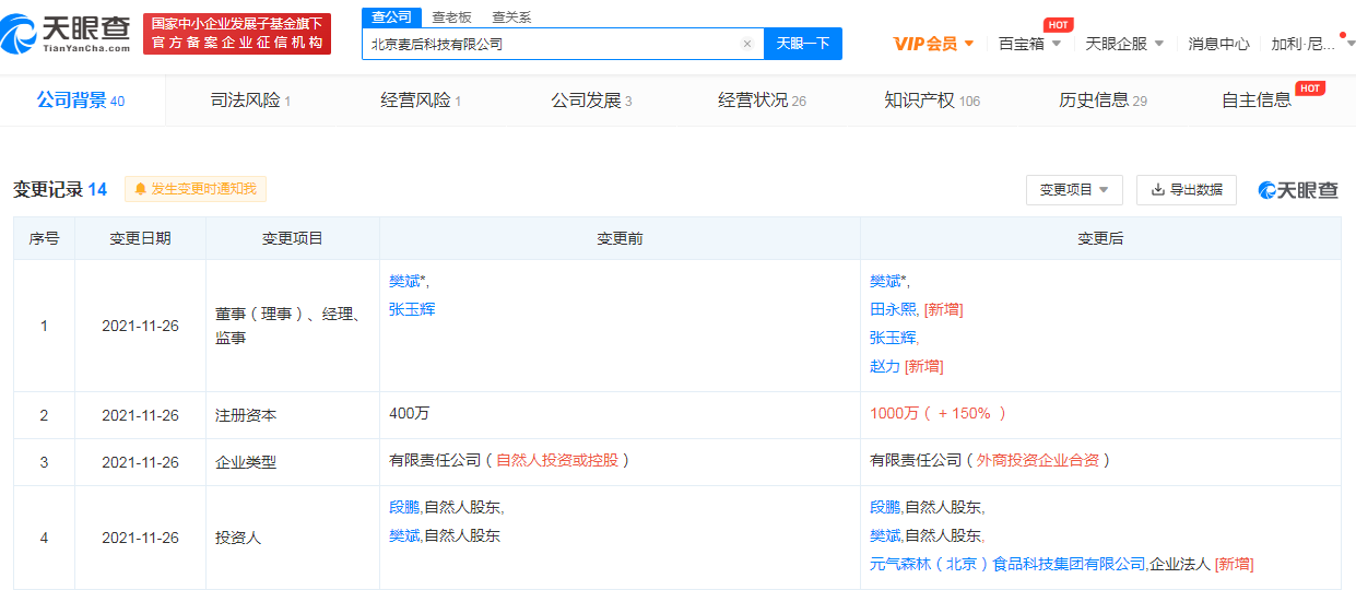 天眼查App显示,近日,北京麦后科技有限公司发生工商变更,原股东上海鸿晗投资管理有限公司退出,新增元气森林(北京)食品科技集团有限公司为股东,持股比例60%,为第一大股东;同时公司注册资本由400万人民币增至1000万人民币,增幅150%。