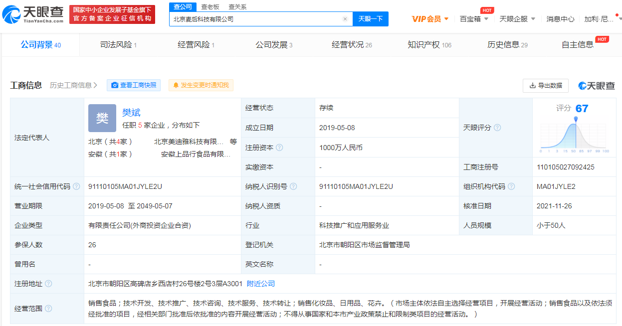 麦后科技成立于2019年5月,法定代表人为樊斌,经营范围含销售食品;技术开发、推广、服务等。据公开信息显示,麦后科技为速食品牌“我的天呐”关联公司,旗下产品包括螺蛳粉、酸辣粉、重庆小面等。