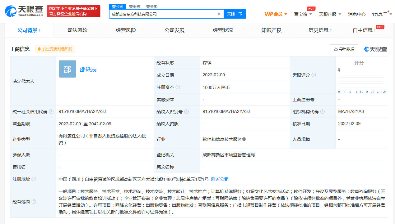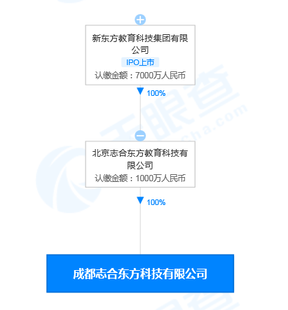 天眼查App显示,2月9日,成都志合东方科技有限公司成立,注册资本1000万人民币,法定代表人为邵轶辰,经营范围包括非居住房地产租赁;互联网销售;互联网信息服务;广播电视节目制作经营等。股权穿透图显示,该公司由新东方教育科技集团有限公司间接全资持股。