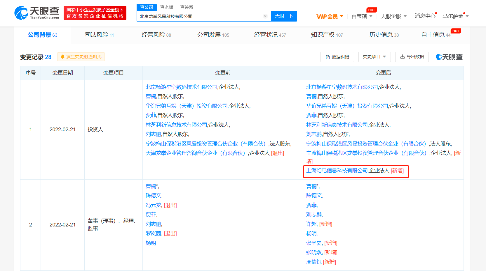天眼查App显示,近日,北京龙拳风暴科技有限公司发生工商变更,股东新增B站关联公司上海幻电信息科技有限公司等。