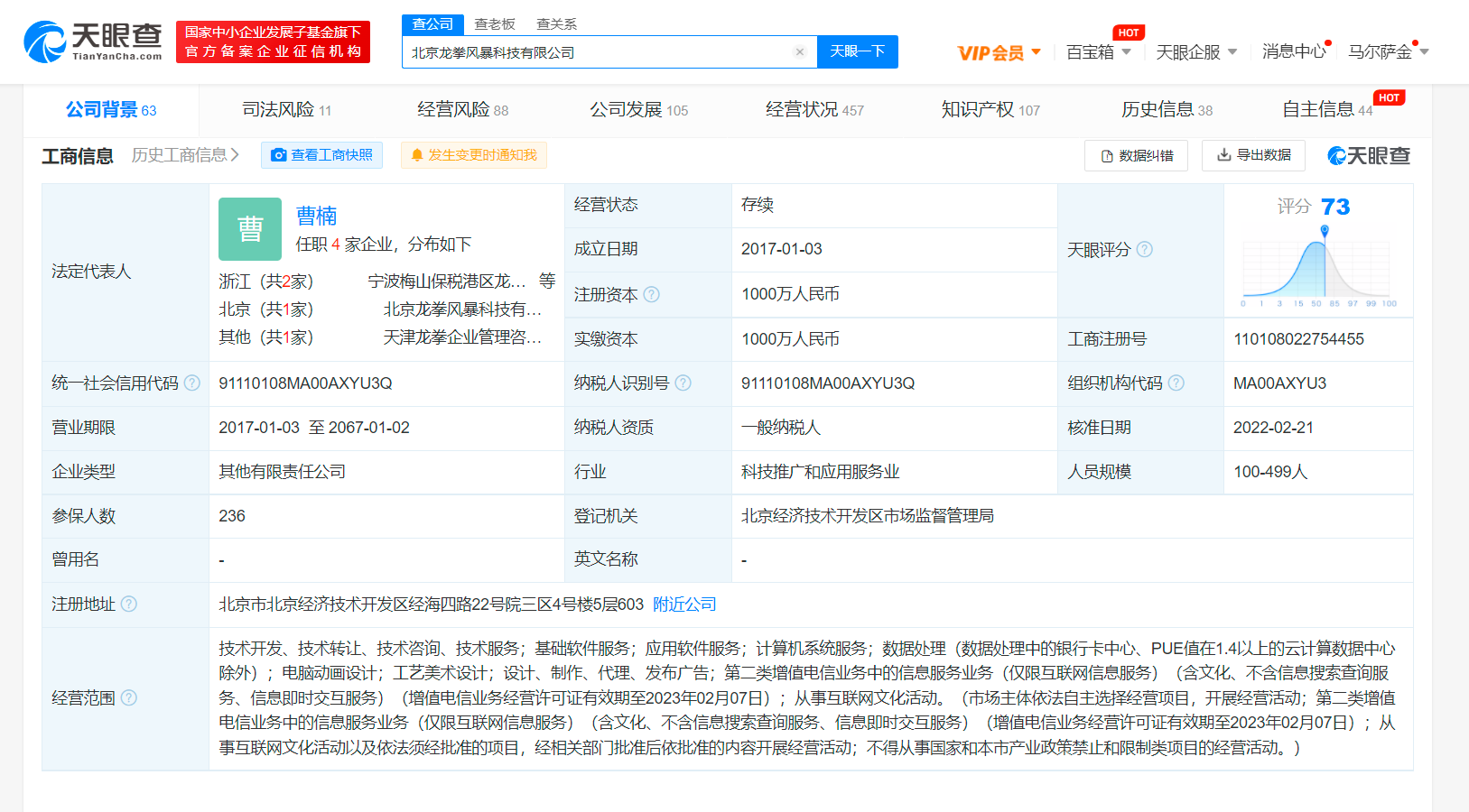 北京龙拳风暴科技有限公司成立于2017年1月,法定代表人曹楠,注册资本1000万人民币。股东信息显示,该公司由腾讯关联公司林芝利新信息技术有限公司、华谊兄弟互娱(天津)投资有限公司等共同持股。