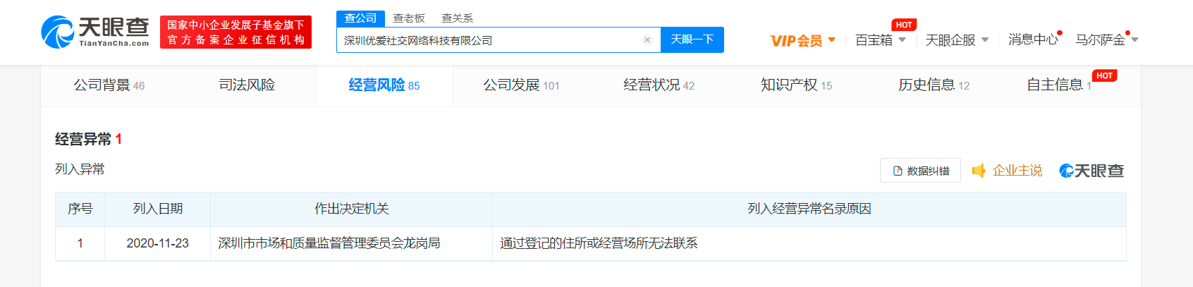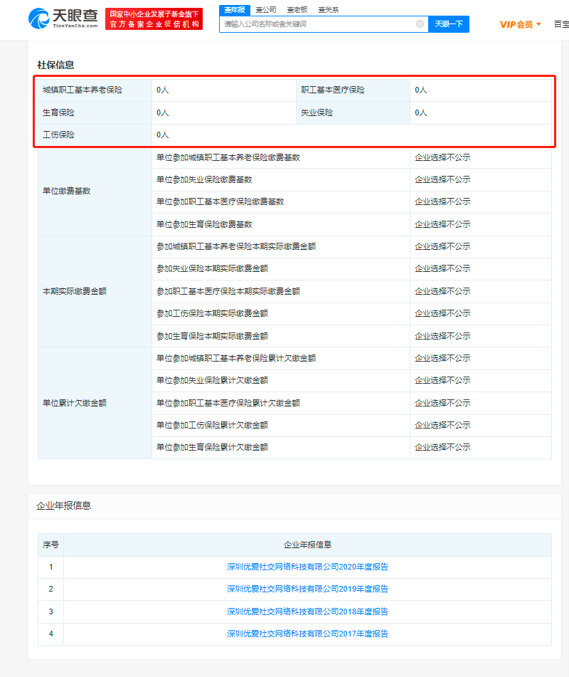值得注意的是,2020年11月,因通过登记的住所或经营场所无法联系,深圳优爱社交网络科技有限公司被深圳市市场和质量监督管理委员会龙岗局列入经营异常名录。此外,该公司2020年年报信息显示, 其社保缴纳人数为0人。