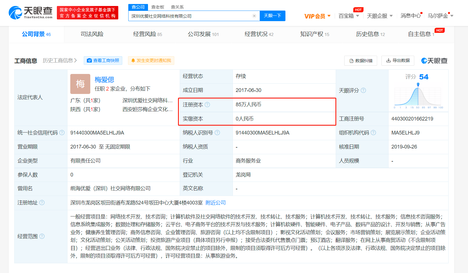 据悉,梅爱偲为Ulovebaby品牌创始人,该品牌网站宣称为“乌克兰合法海外试管婴儿辅助生殖医院全产业链平台”。天眼查App显示,Ulovebaby主体运营公司为深圳优爱社交网络科技有限公司,法定代表人及最大股东为梅爱偲,持股比例60%。该公司注册资本85万人民币,而实缴资本为0。