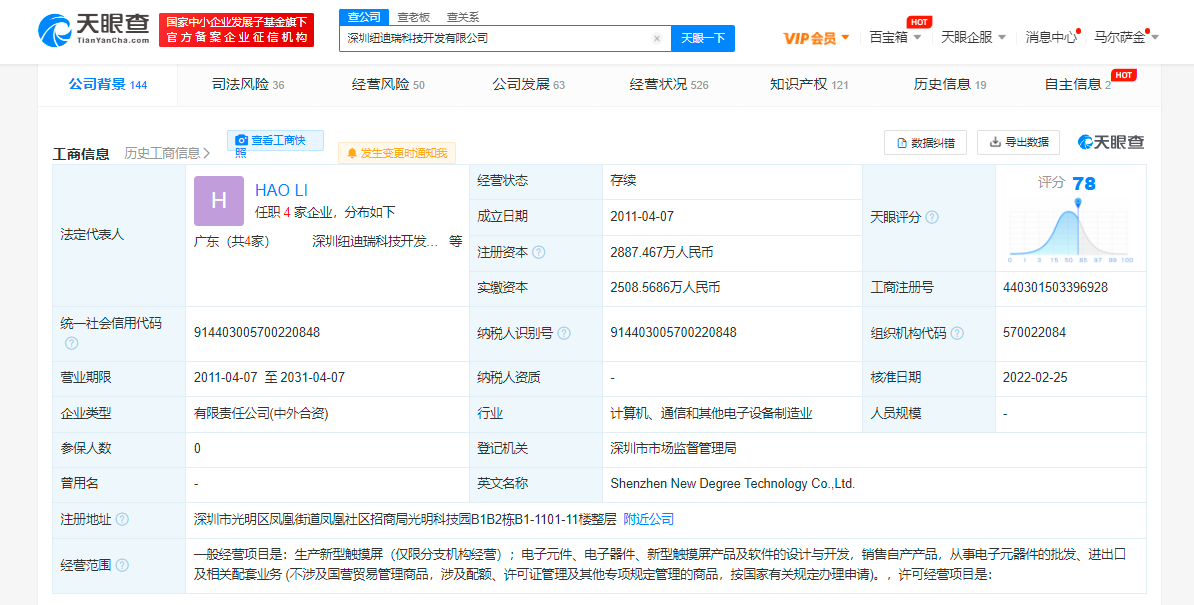 深圳纽迪瑞科技开发有限公司成立于2011年4月,法定代表人为Hao Li,注册资本2888万人民币,经营范围包括生产新型触摸屏;电子元件、电子器件、新型触摸屏产品及软件的设计与开发等。该公司网站显示,纽迪瑞科技专注于压力感应触控技术,是领先的压力触控解决方案提供商。