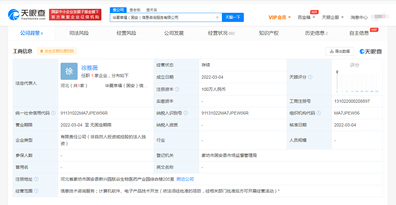 近日,华夏幸福(固安)信息咨询服务有限公司成立,法定代表人为徐雅薇,注册资本100万人民币,经营范围包括信息技术咨询服务;计算机软件、电子产品技术开发。股东信息显示,该公司由华夏幸福基业股份有限公司全资控股。
